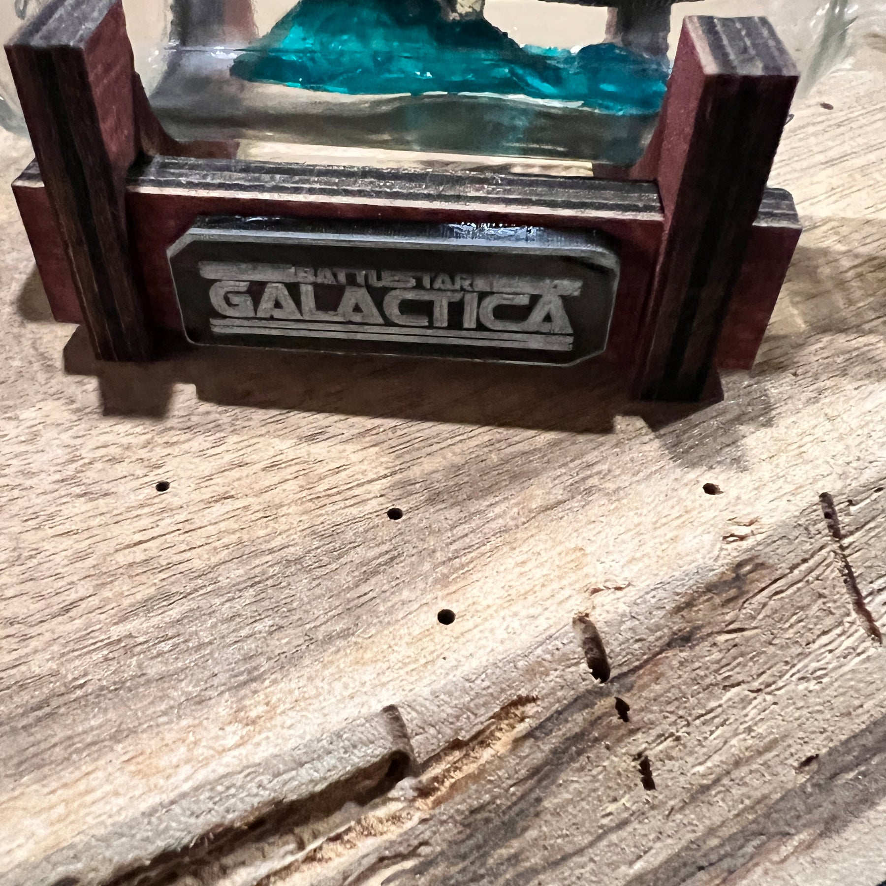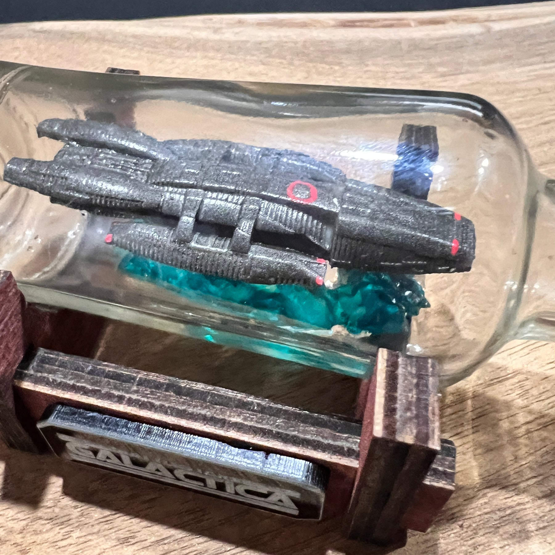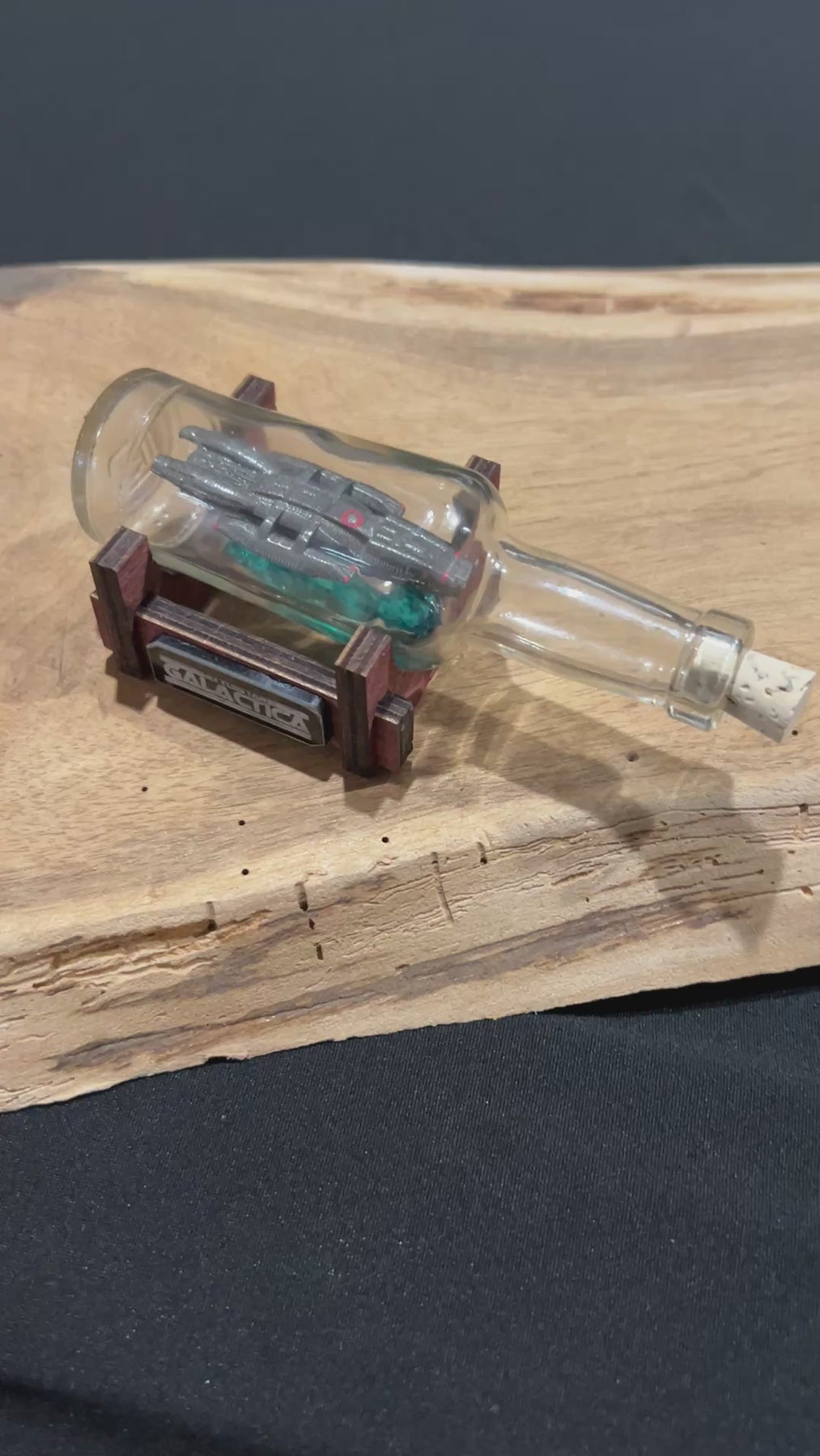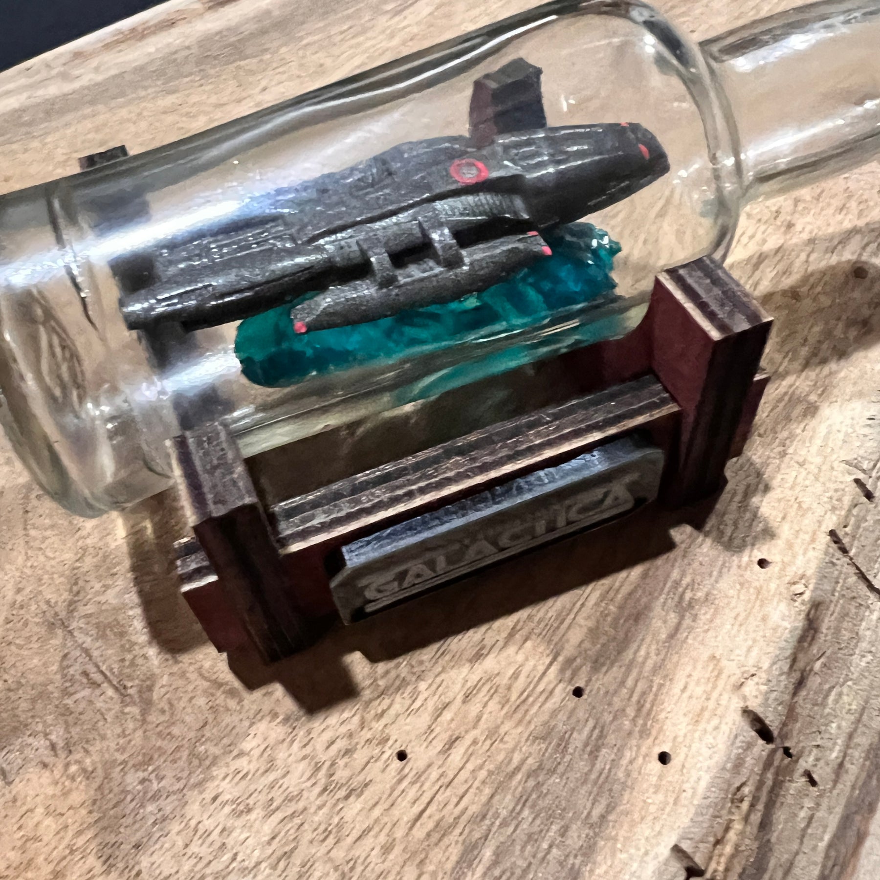 The last Battlestar, Galactica. So say we all! Forever yours safe in its own little shot bottle. Includes wood stand and laser engraved plaque.