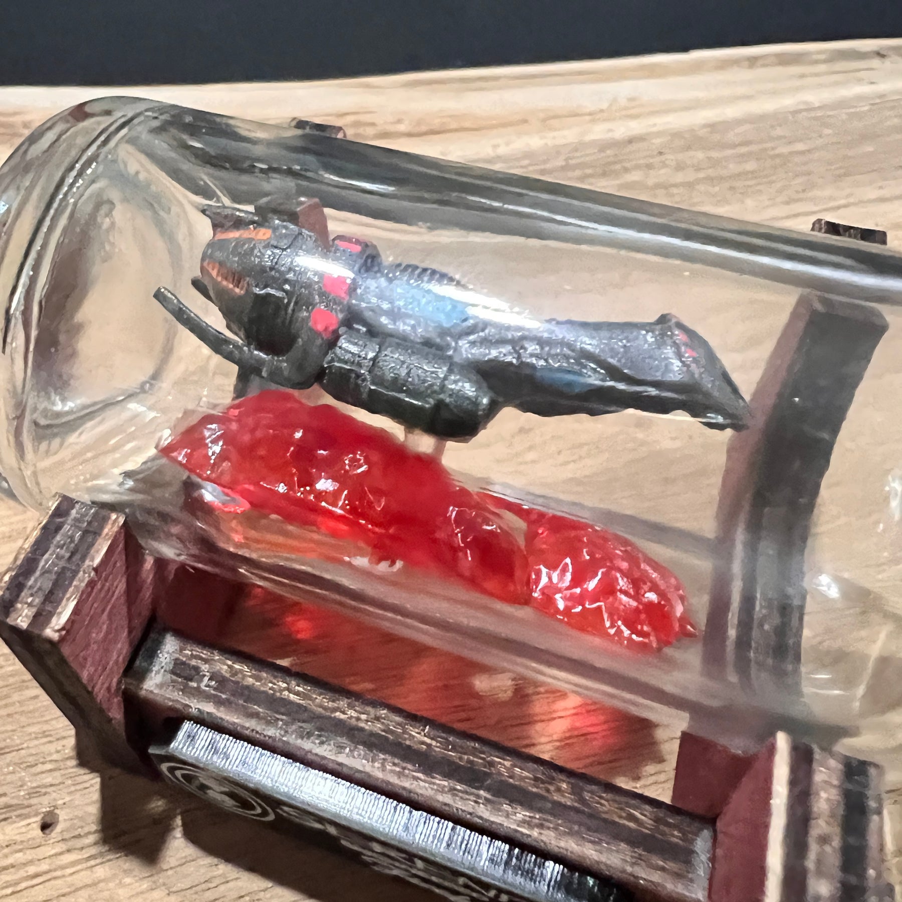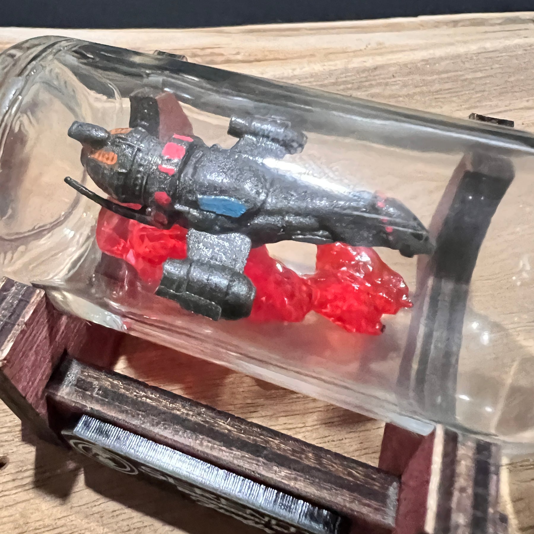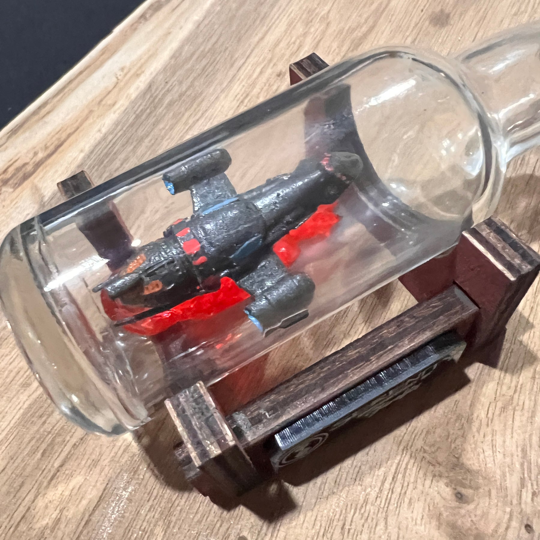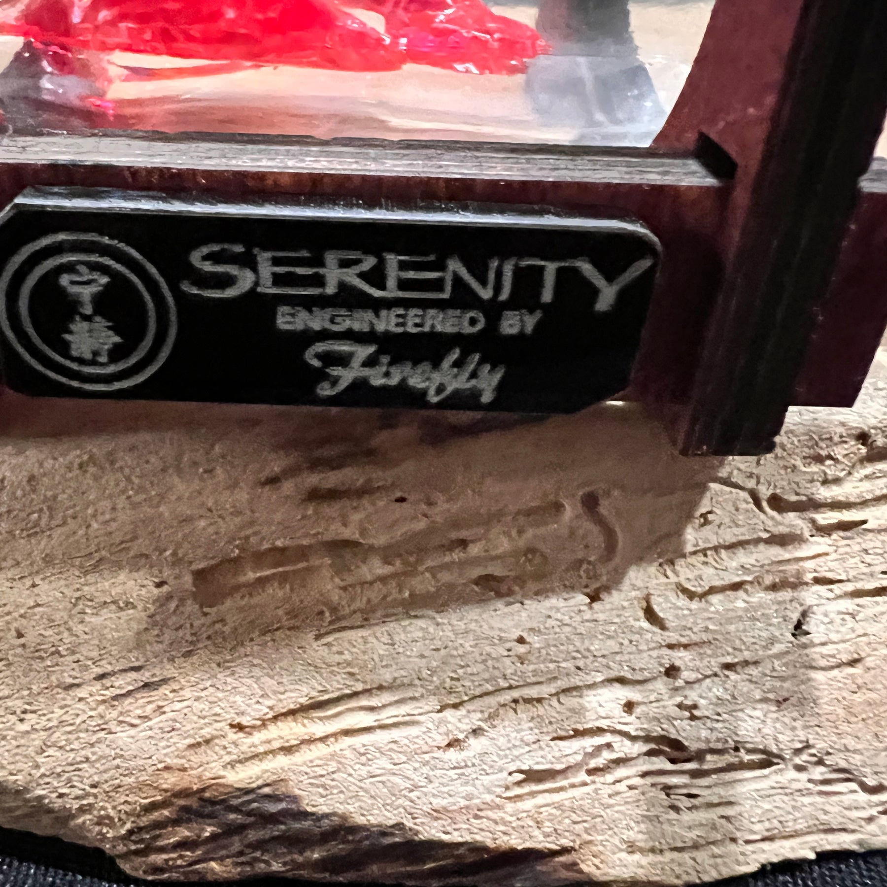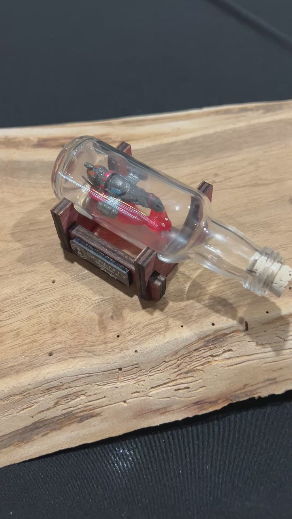 Everyone’s favorite Firefly, the Serenity. She’s shiny. Forever yours safe in its own little shot bottle. Includes wood stand and laser engraved plaque.