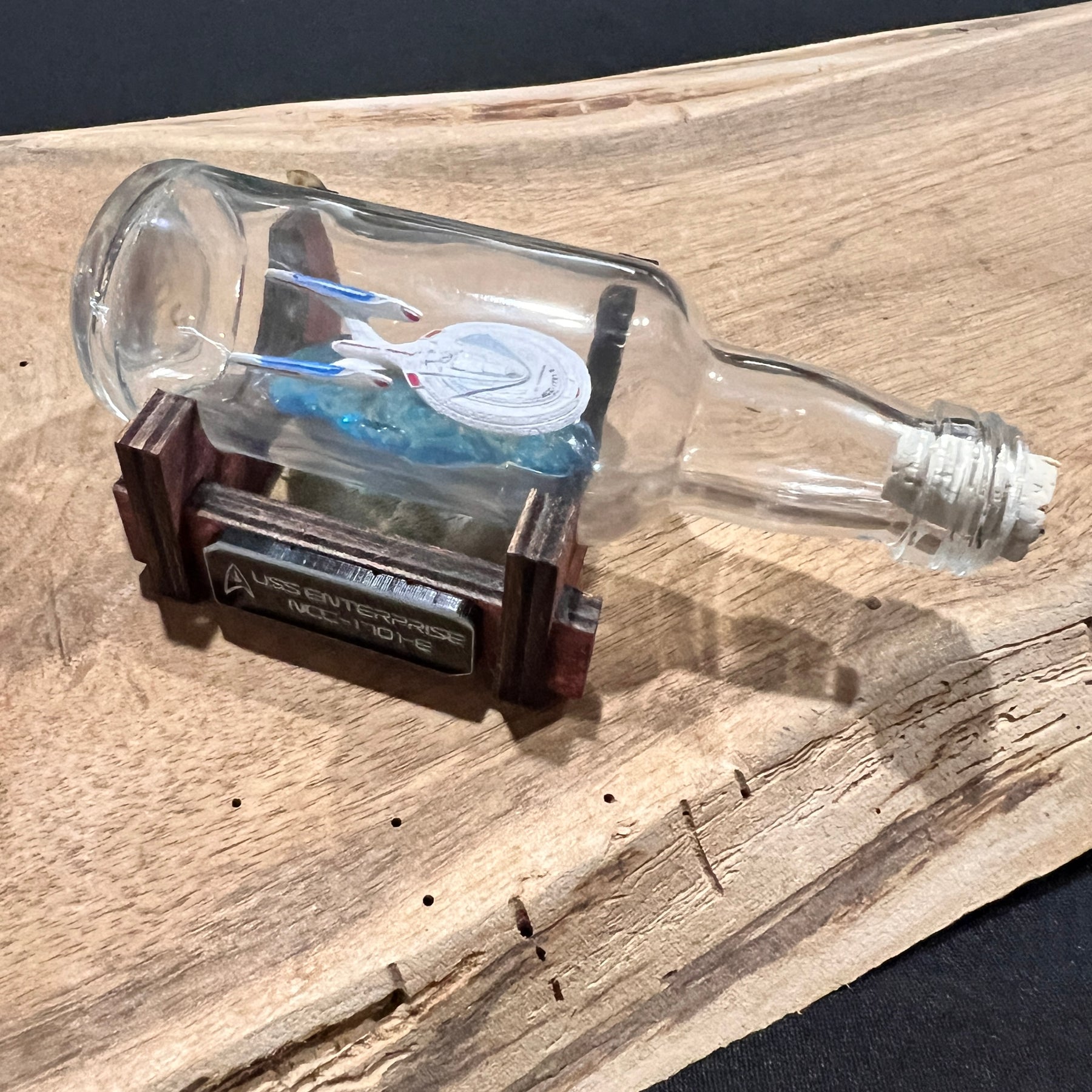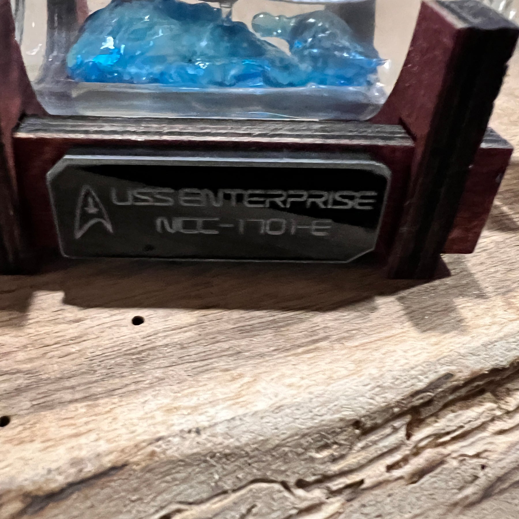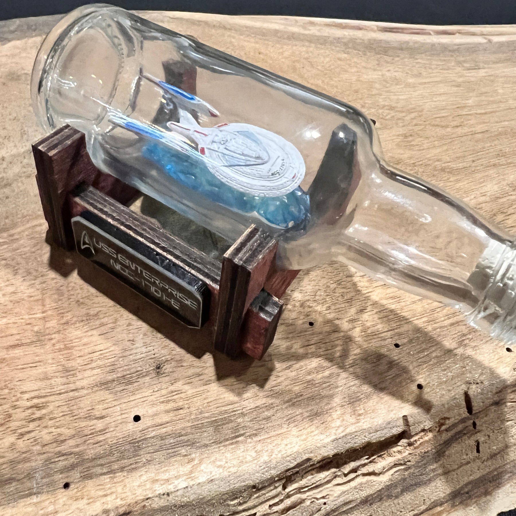 USS Enterprise NCC-1701-E. Forever yours safe in its own little shot bottle. Includes wood stand and laser engraved plaque.