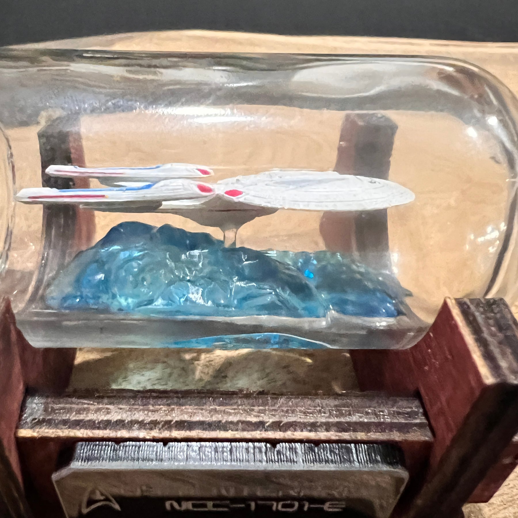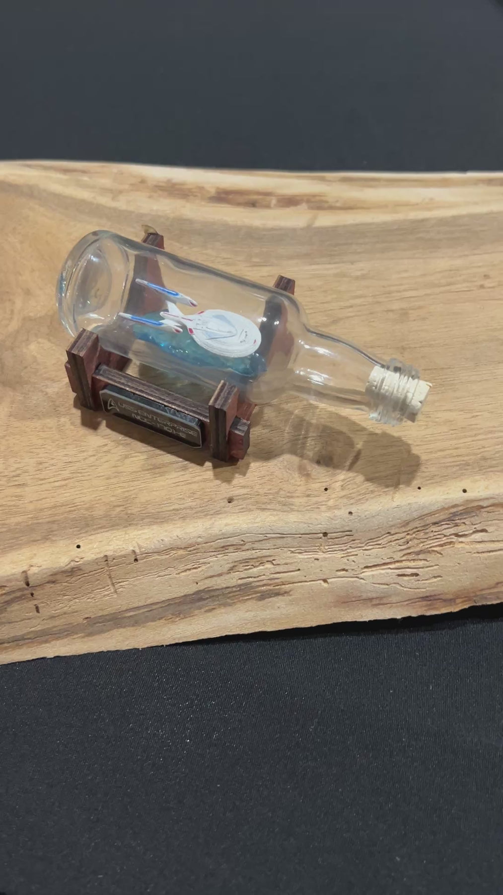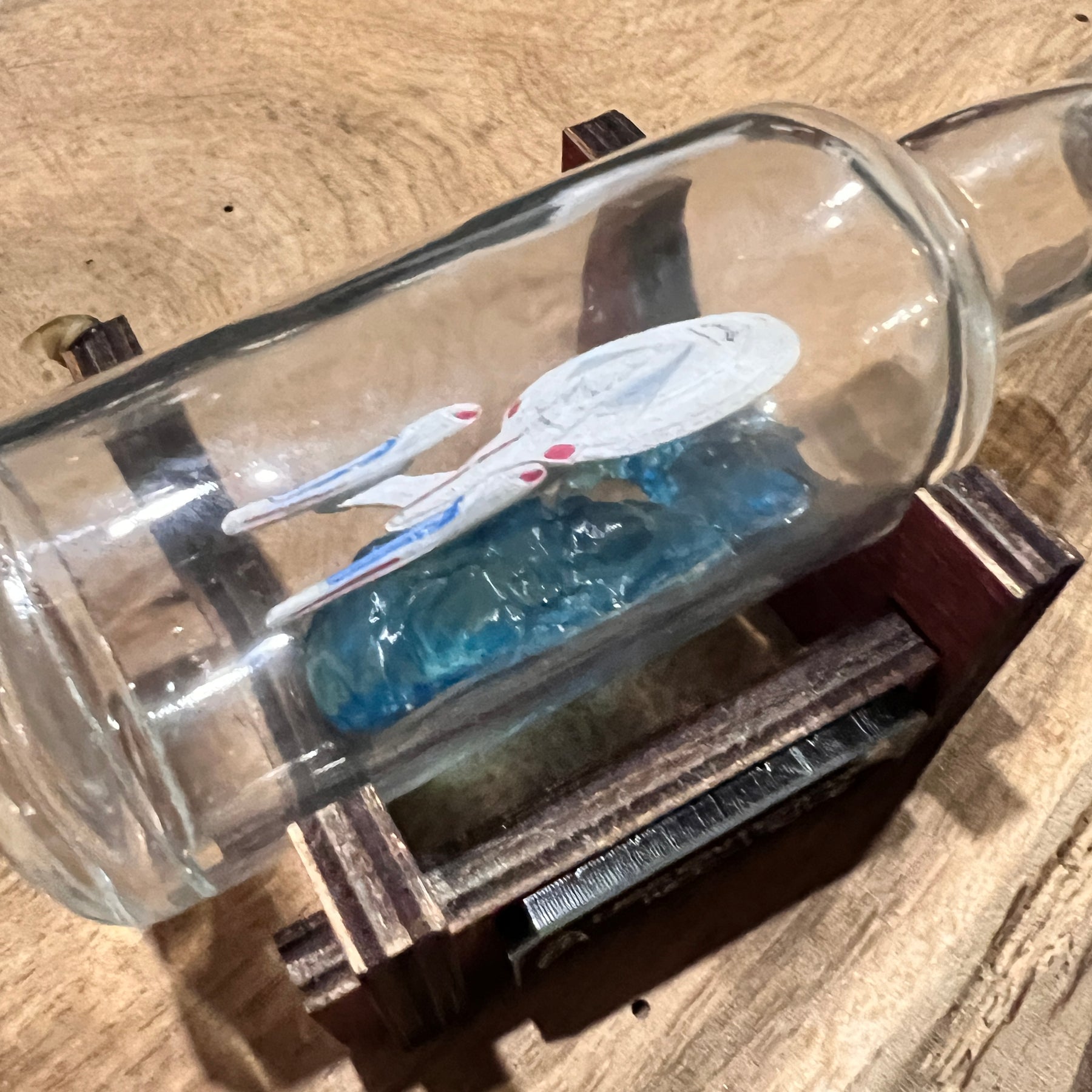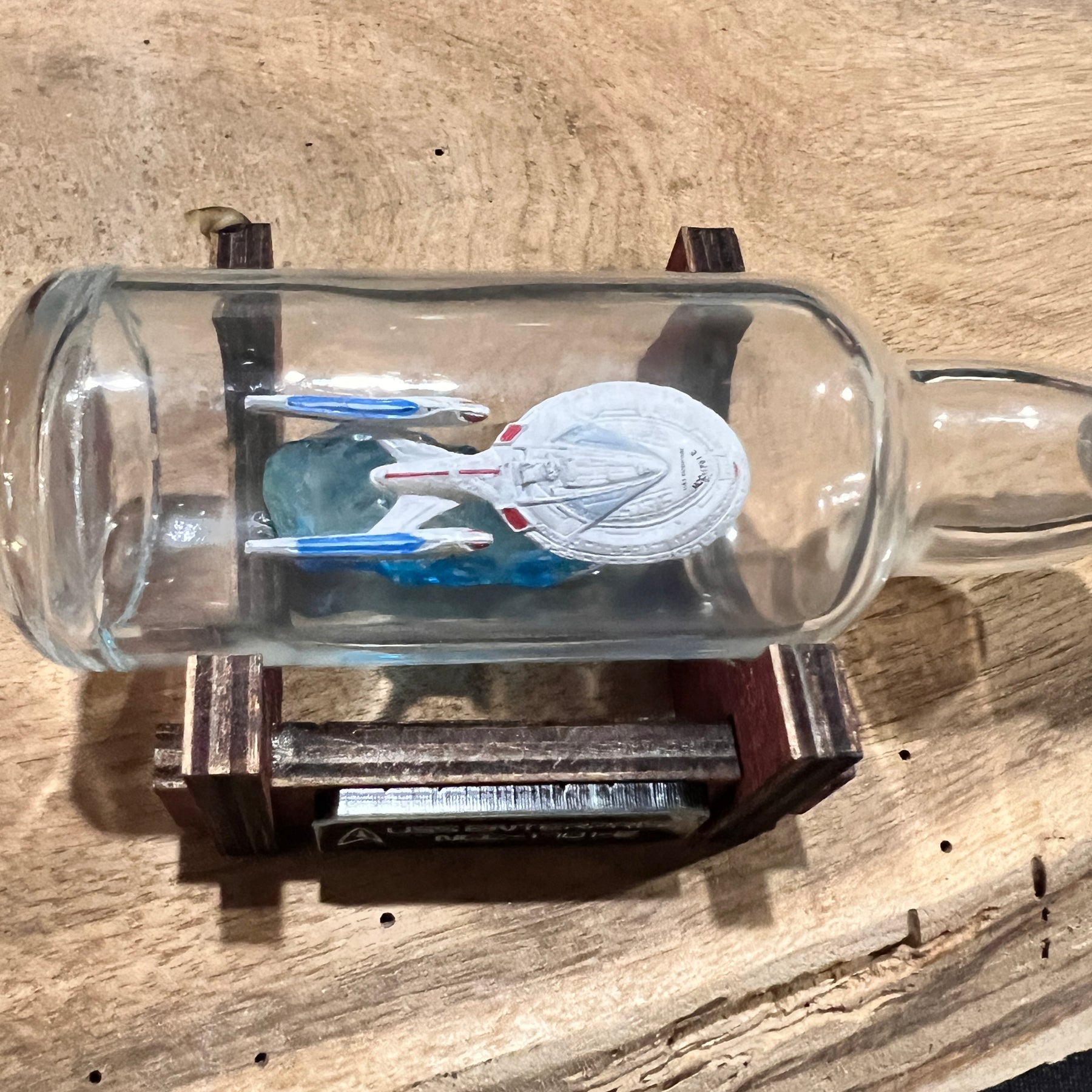 USS Enterprise NCC-1701-E. Forever yours safe in its own little shot bottle. Includes wood stand and laser engraved plaque.