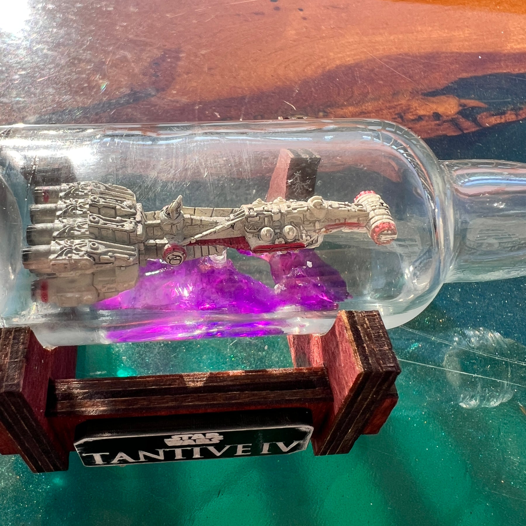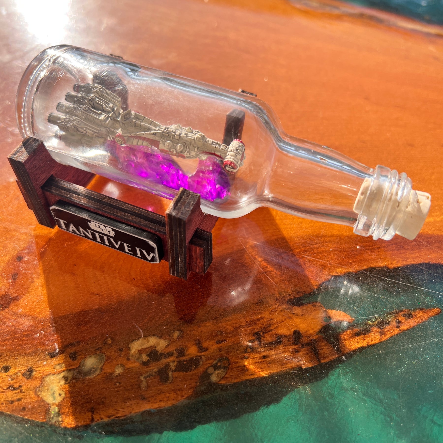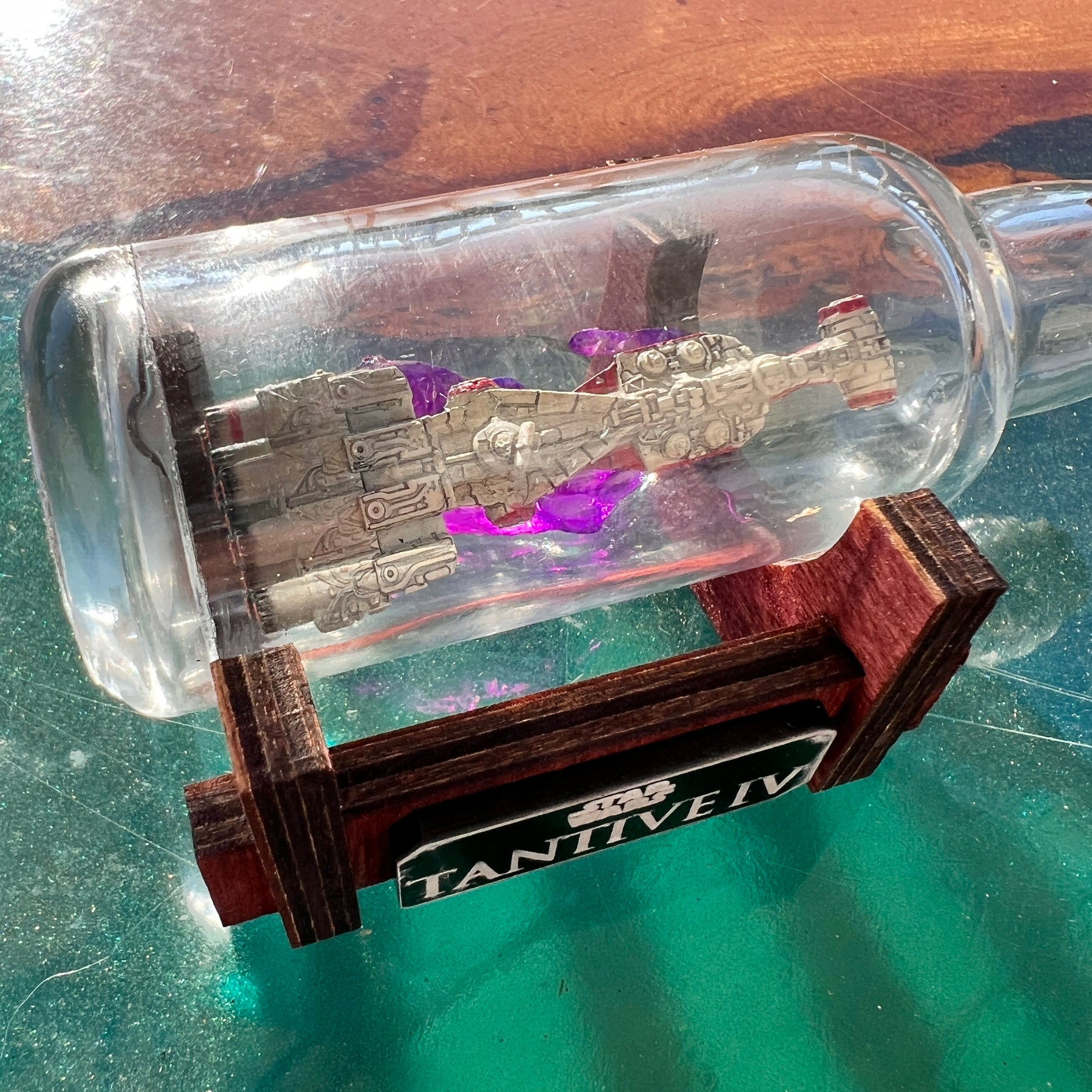 The Tantive IV. The most famous CR90 in Star Wars.The ship is permanently glued into the bottle but the cork is removable. Bottle is approximately 3” long and 1.5”diameter. The shot bottle size makes it great for displaying in small spaces. Wood display stand and laser engraved plaque are included.
