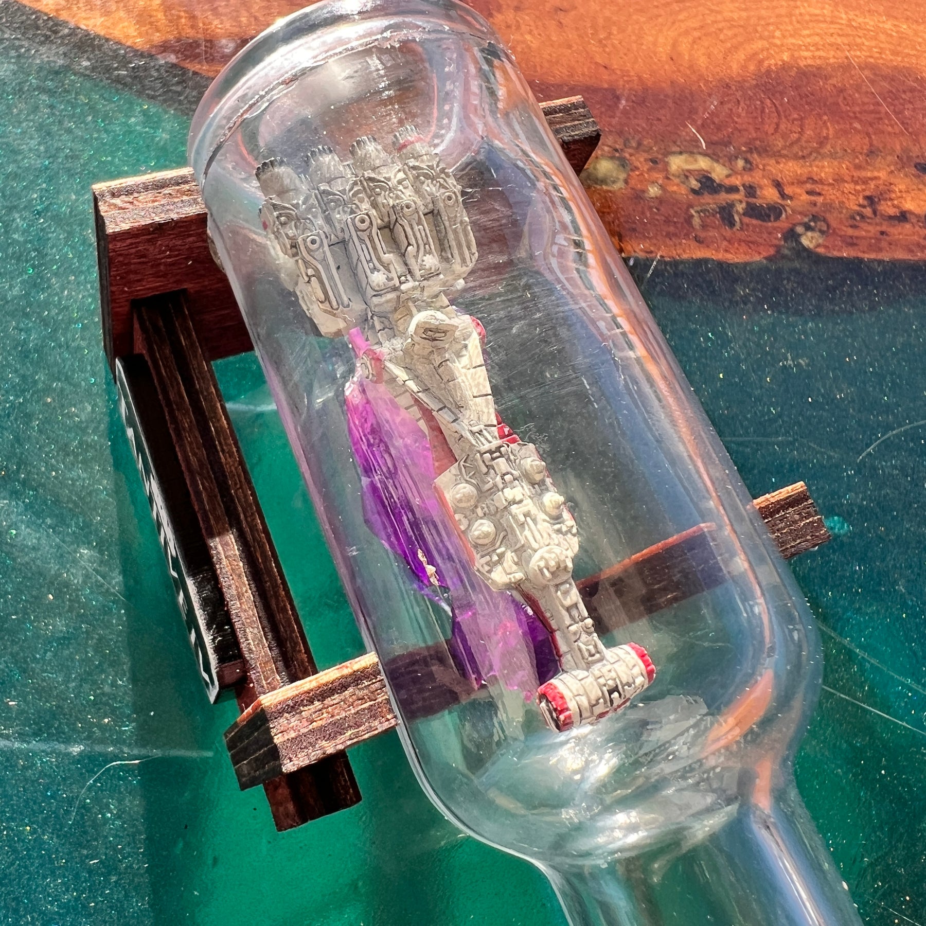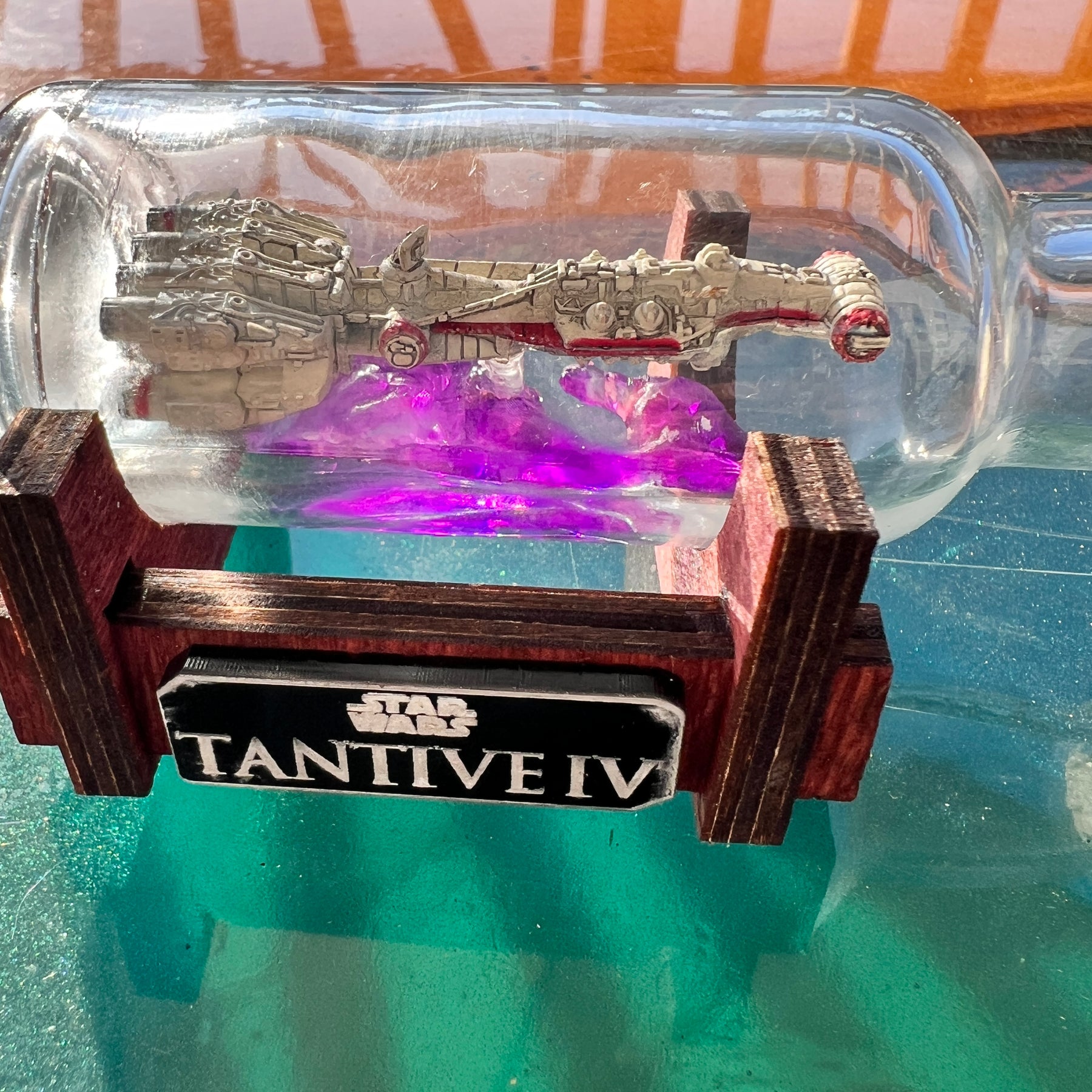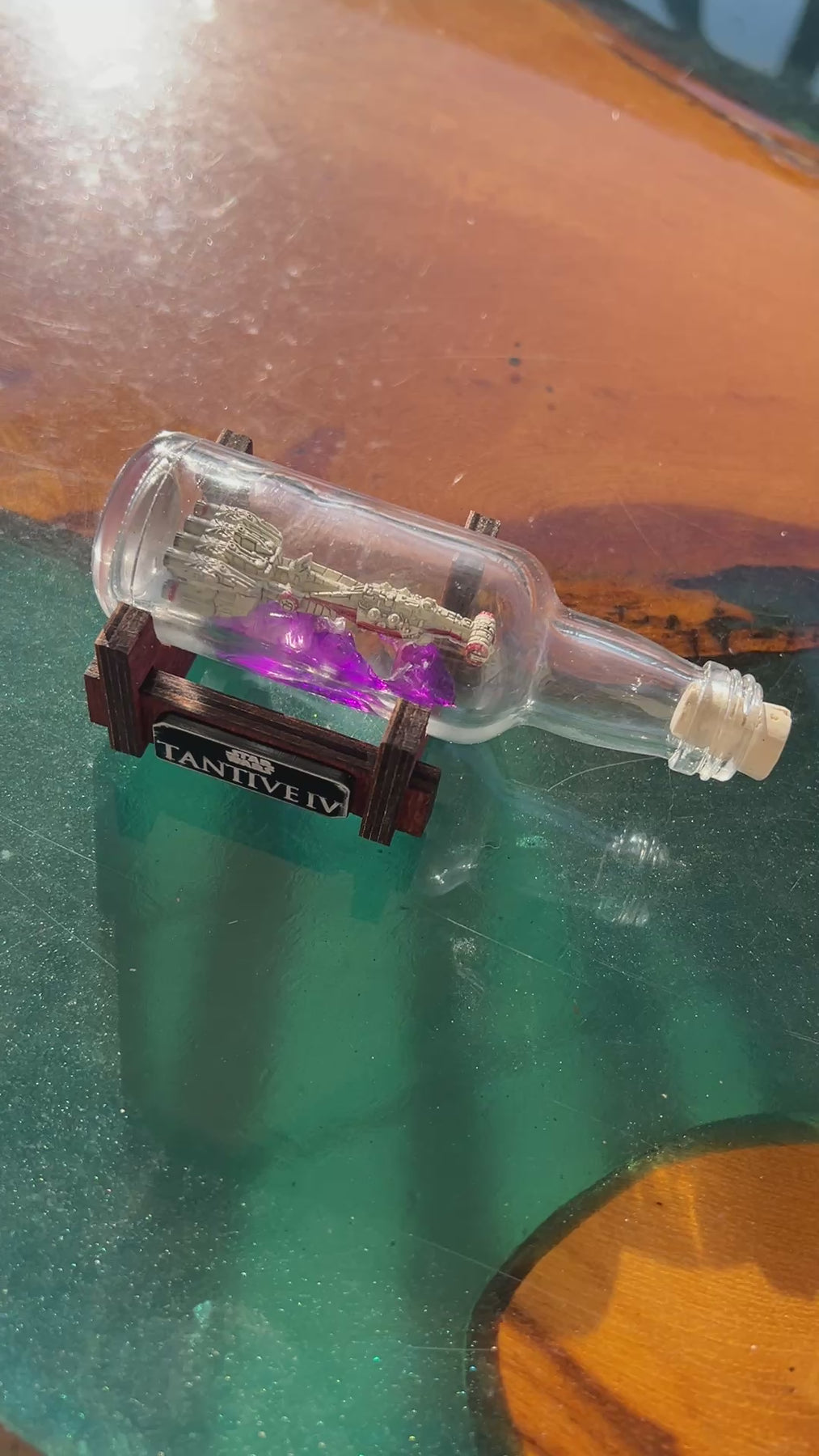 The Tantive IV. The most famous CR90 in Star Wars.The ship is permanently glued into the bottle but the cork is removable. Bottle is approximately 3” long and 1.5”diameter. The shot bottle size makes it great for displaying in small spaces. Wood display stand and laser engraved plaque are included.