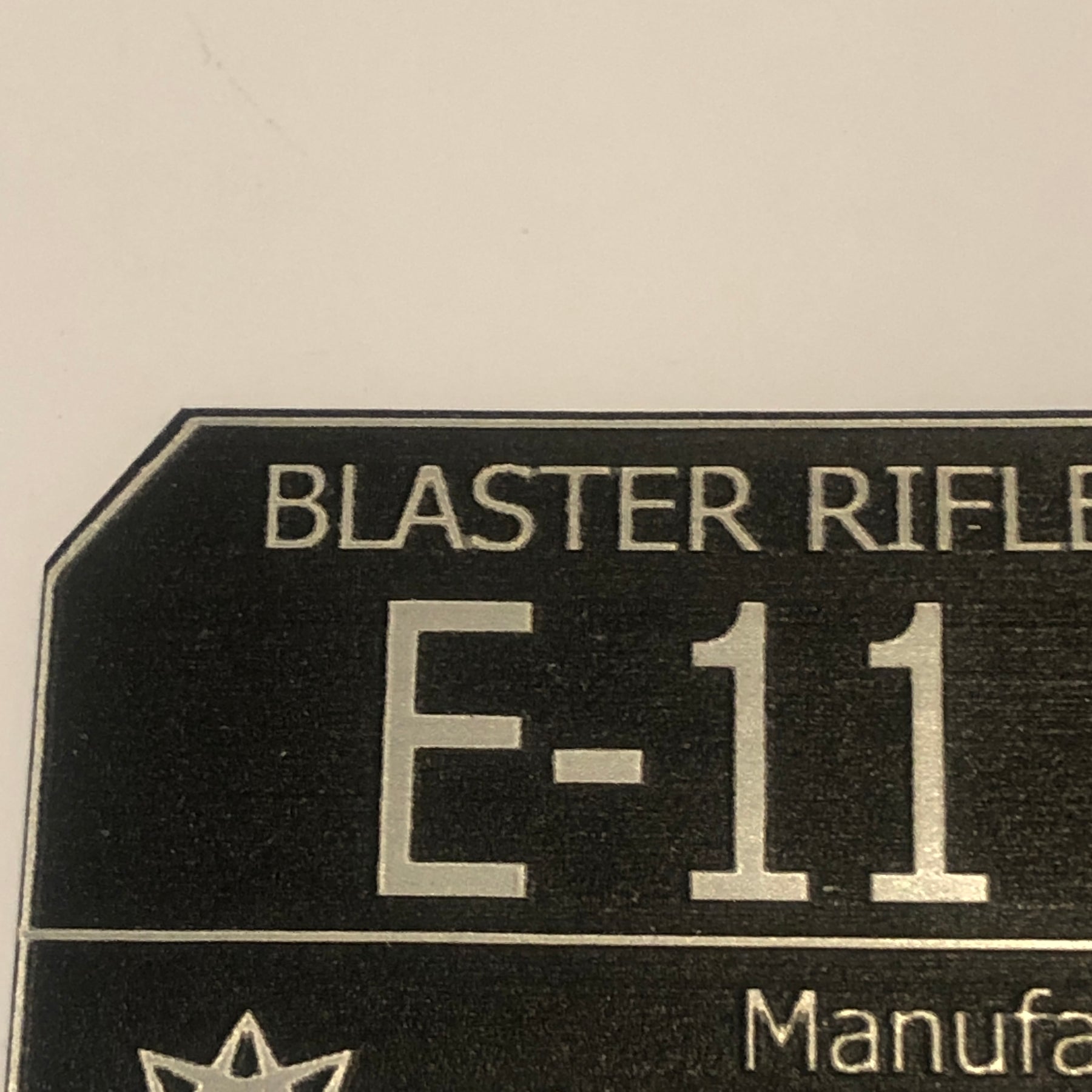Laser engraved plaque for a E-11 Blaster. The plaque is laser engraved on acrylic and makes a perfect accent for your E-11 Star Wars Blaster.